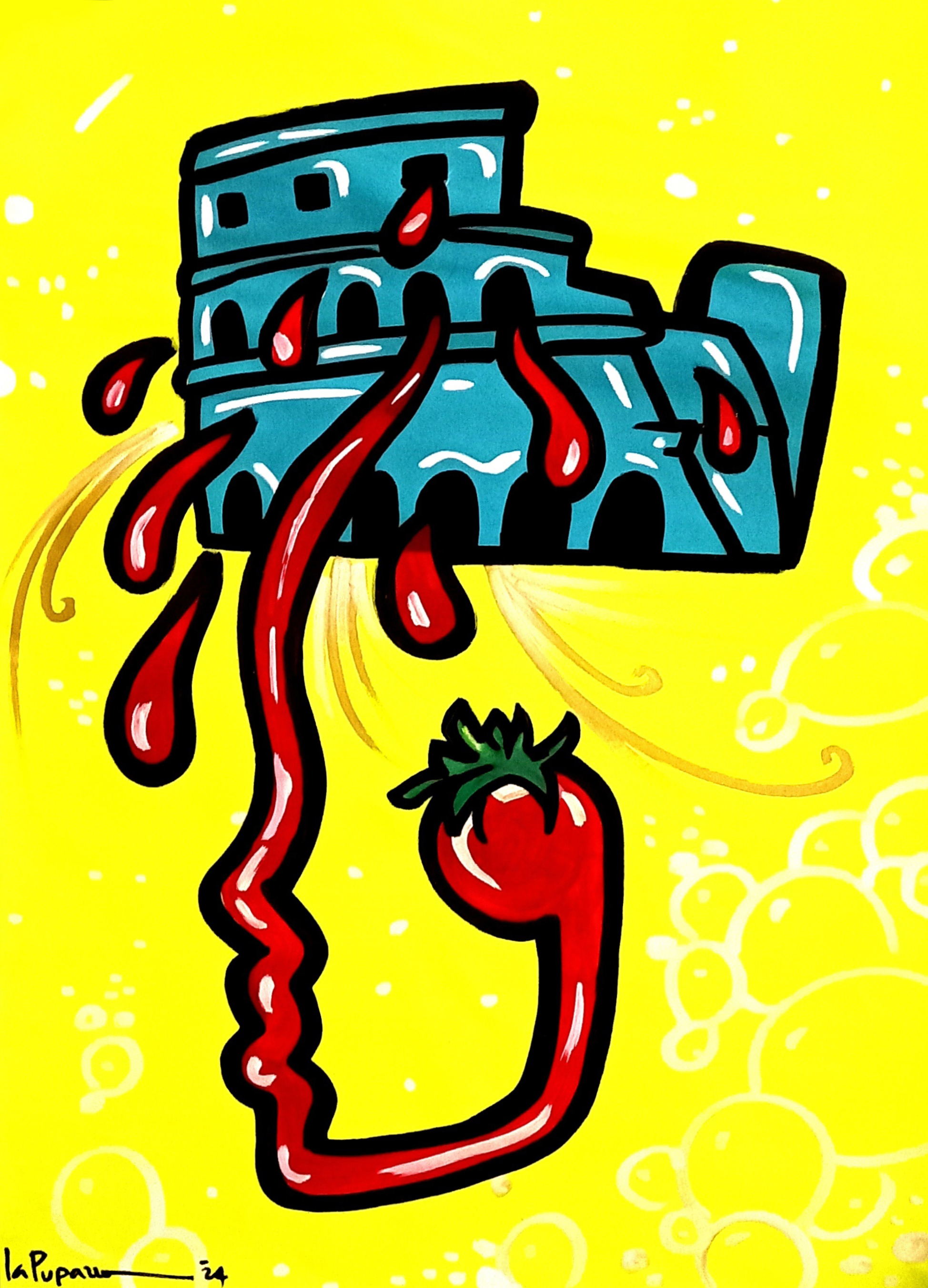 La Pupazza porta con sé la sua ironia pungente e una capacità unica di mescolare linguaggi e materiali. Quadri su tavola e carta, oggetti di design, installazioni immersive: ogni opera è un invito a entrare nel suo universo giocoso e provocatorio. Bottiglie di sugo personalizzate, finte pozzanghere di pomodoro e angoli narrativi sono solo alcune delle sorprese che catturano lo sguardo e stimolano la mente.