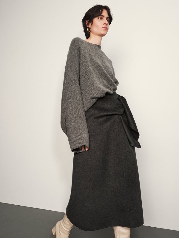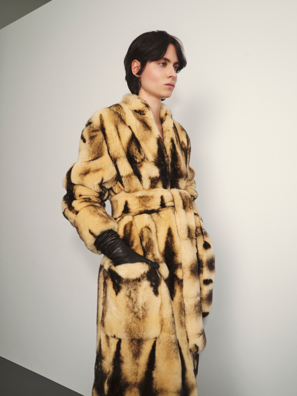 Tra i capispalla si distinguono una pelliccia di coniglio particolarmente morbida al tatto, che dà forma a uno dei modelli più femminili ed eleganti della collezione, e un cappotto in cashmere grigio dal taglio giapponese, morbido e avvolgente, impreziosito da un grande bottone tondo martellato color argento, reinterpretazione contemporanea dei bottoni marinari delle stagioni passate.