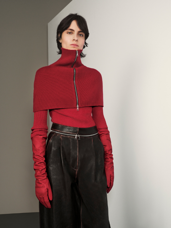 I materiali raccontano la storia di una donna in movimento: lana, cashmere e tessuti tecnici, scelti con grande attenzione alla qualità, garantiscono comfort e struttura, mentre pelle trattata effetto vintage e mantelle in costina introducono una dimensione nomade, vissuta e sofisticata.