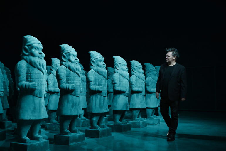 L’arte di Papeschi propone una riflessione ironica e provocatoria su come una civiltà aliena potrebbe interpretare la nostra storia, dopo l’estinzione umana. Il progetto si snoda in diversi capitoli, ricostruendo frammenti della nostra cultura attraverso un punto di vista distorto, nel tentativo di dare un senso ai reperti umani. Zwergen Dämmerung: La Guerra come Retaggio dell’Umanità Il primo capitolo, “Zwergen Dämmerung” (Il Crepuscolo dei Nani), ci presenta un esercito di terracotta composto da 54 figure con corpi di guerrieri di Xi’an e teste di nani da giardino.