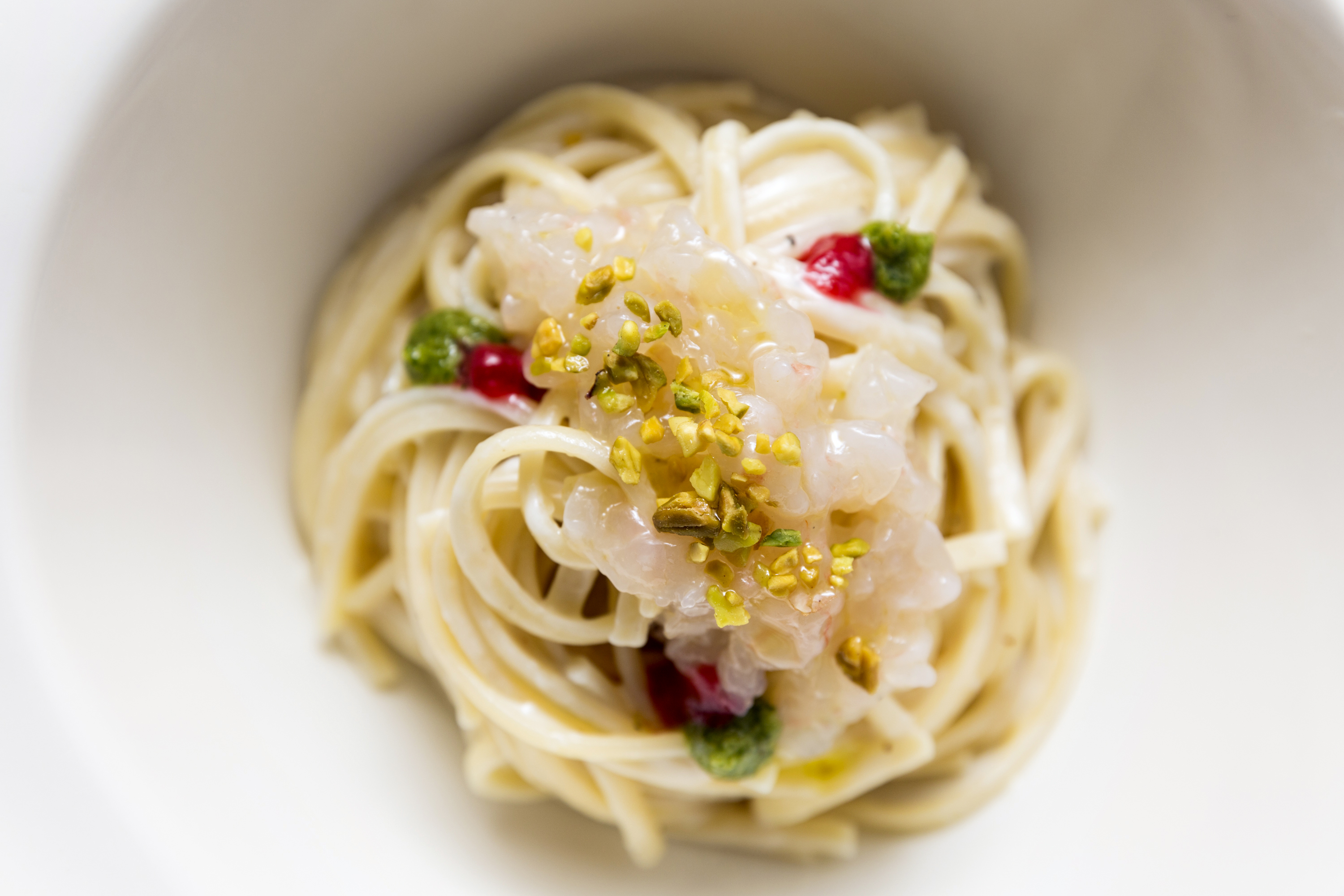 Passando agli Antipasti, primeggiano il “Cubo di maiale nero di Nebrodi stufato con birra, yogurt e paprica affumicata su emulsione di peperoni arrosto” e la “Tartare di gambero rosso alla catalana e stracciatella”: combinazioni ideali che anticipano la fantasia dei piatti che compongono i Primi con proposte vegetariane come il “Tortello con ricotta di bufala e radicchio, mela, pepe affumicato e cacio podolico” e sapori decisi come quelli degli “Gnocchetti al basilico con battuto di agnello al Nebbiolo, pistacchi e parmigiano vacche rosse 32 mesi”.
