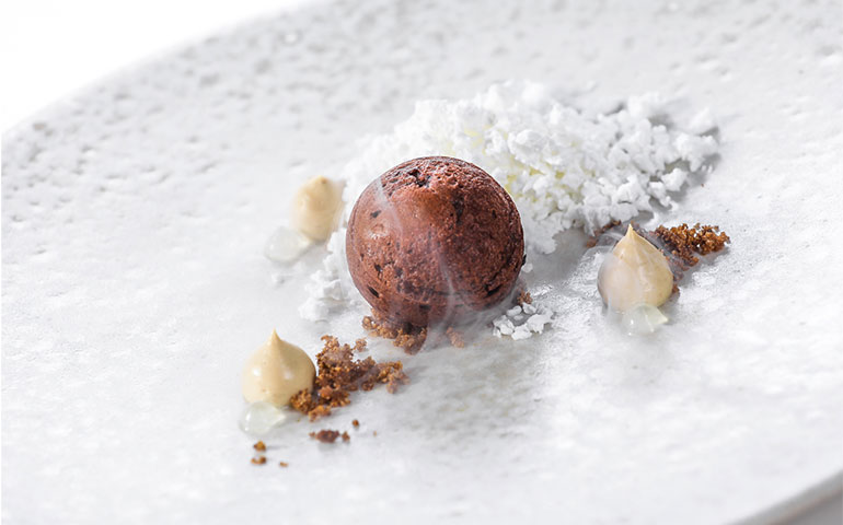 Unire tutti gli ingredienti, emulsionare al minipimer. Lasciar riposare 30’ a +4C. Versare l’appareil nell’apposita piastra, inserire la sfera di gianduia e formare il canederlo. Nel piatto disporre la crema alla nocciola, il panettone croccante, le nocciole caramellate, i pop corn di latte ed il canederlo.
