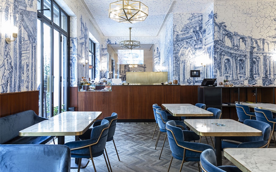 Nel ristorante il colore blu, quasi turchese, è predominante. Il locale strizza l’occhio al design (spettacolari le posate utilizzate per il servizio). Molto bello l’accostamento del marmo, del color oro e del pavimento in cotto etrusco disposto a lisca di pesce. Alle pareti una carta da parati bellissima che si rifà alle vedute dei Piranesi, una rivisitazione in chiave contemporanea dell’architettura italiana del Settecento e Ottocento.