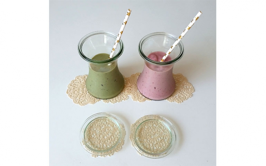 3. versate gli smoothies in due bicchieri, o in due vasetti in vetro, aggiungete le cannucce e servite ben freddi.