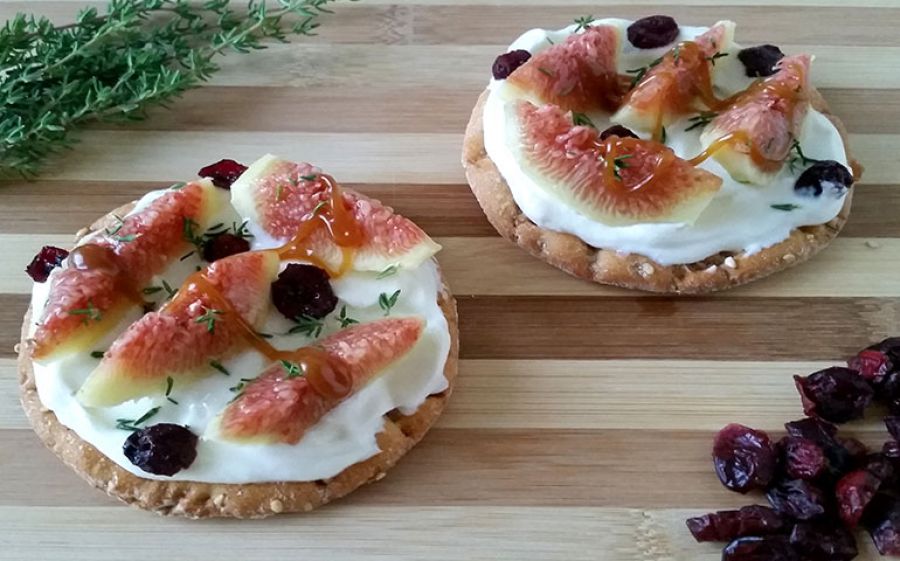 Spalma la crema di robiola sulle tartellette e aggiungi le fettine di fico, i mirtilli rossi e le foglioline di timo.