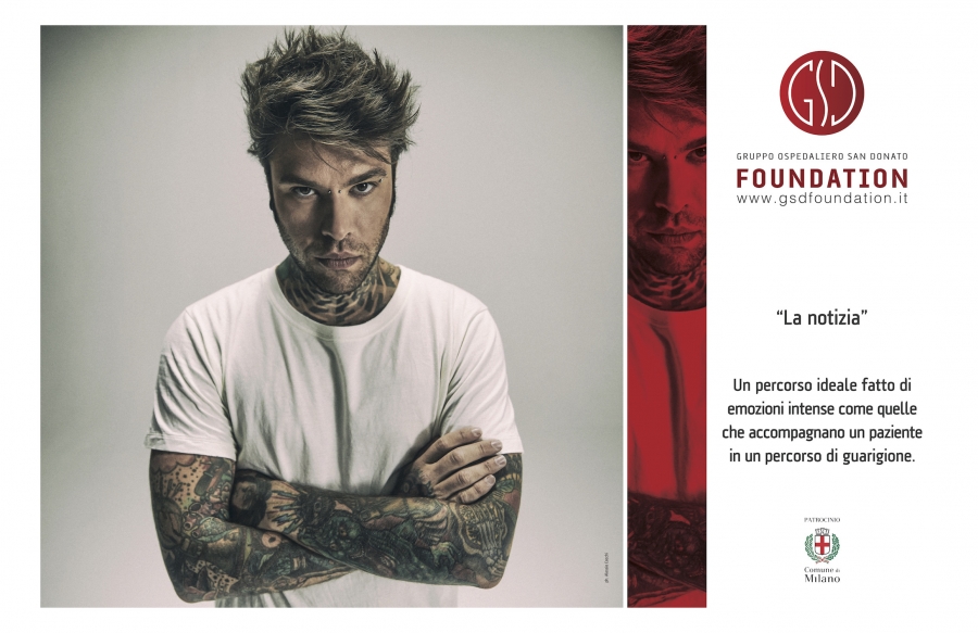 Fedez sceglie di posare a scopo benefico per il fotografo Alessio Cocchi: dal 10 settembre le sue immagini decoreranno le pareti di Corso Vittorio Emanuele e via Dante, a Milano, per sostenere il GSD Foundation.