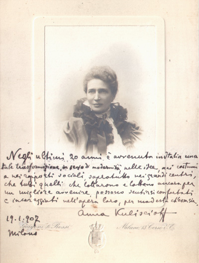 Figura emblematica della lotta per i diritti della donna e per una reale parità fuori e dentro la famiglia, argomenti trattati nel suo "Monopolio dell'uomo", ed esponente di spicco del Partito Socialista Italiano, Anna Kuliscioff nasce in Crimea intorno al 1855 da una famiglia di commercianti ebrei. Vive segnata da una formazione culturale elevata che la porta a desiderare di voler continuare gli studi. Per questa ragione si trasferisce a Zurigo iscrivendosi al Politecnico -Dipartimento di Scienze esatte- che con lei iscrive per la prima volta una donna.