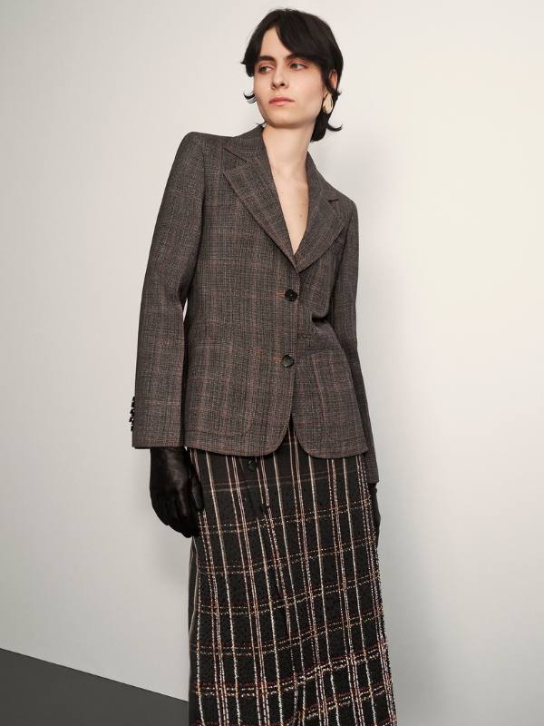 Il nodo, ricorrente su bottoni, chiusure, top annodati e gonne avvolgenti, diventa gesto stilistico e metafora di legame e continuità. Lavorazioni preziose come ricami di perline e crochet realizzati a mano dialogano con giacche maschili e volumi confortevoli, creando un equilibrio armonico tra forza e raffinatezza.