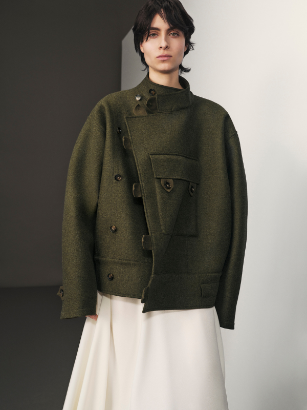 Tra i capispalla si distinguono una pelliccia di coniglio particolarmente morbida al tatto, che dà forma a uno dei modelli più femminili ed eleganti della collezione, e un cappotto in cashmere grigio dal taglio giapponese, morbido e avvolgente, impreziosito da un grande bottone tondo martellato color argento, reinterpretazione contemporanea dei bottoni marinari delle stagioni passate.