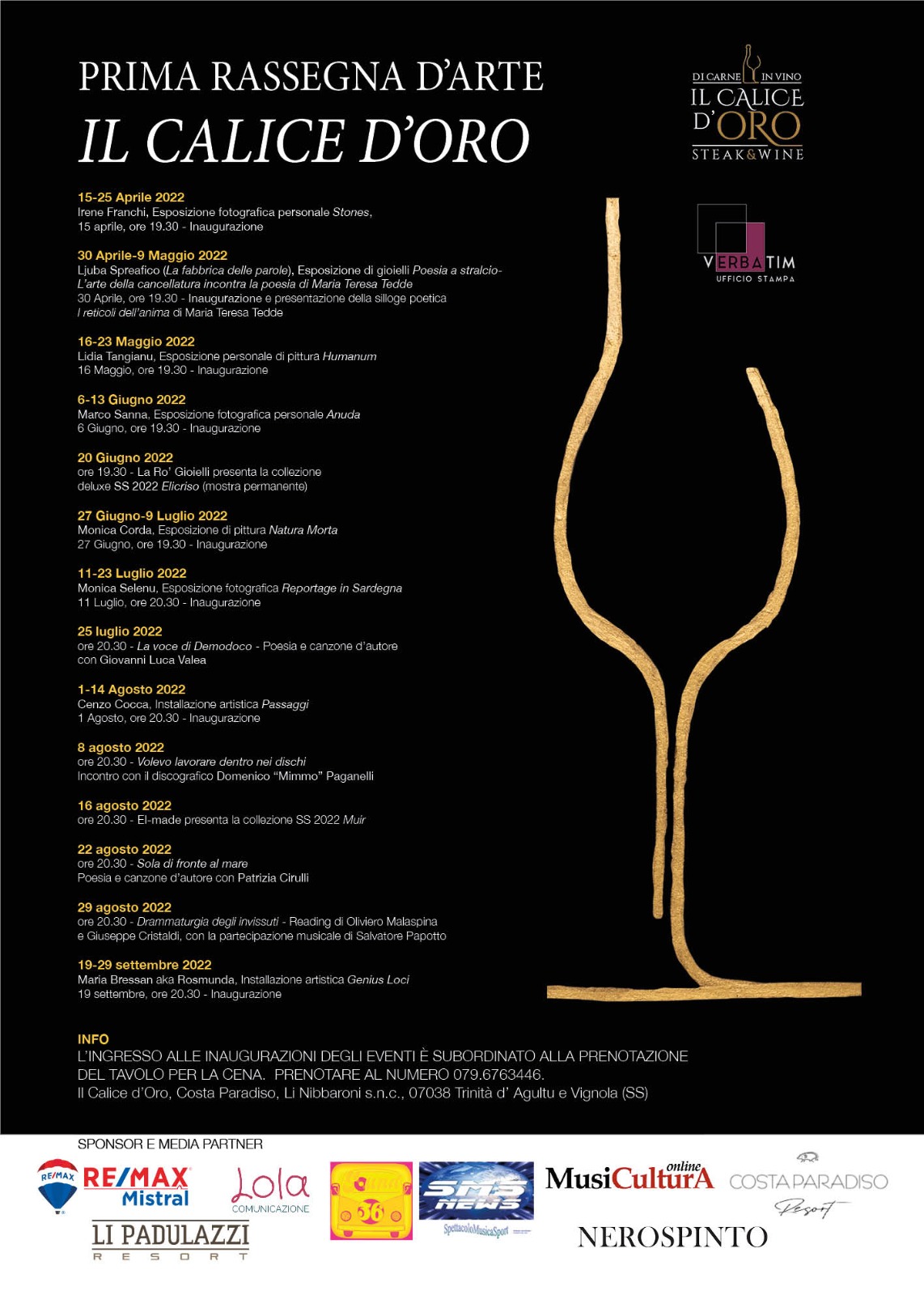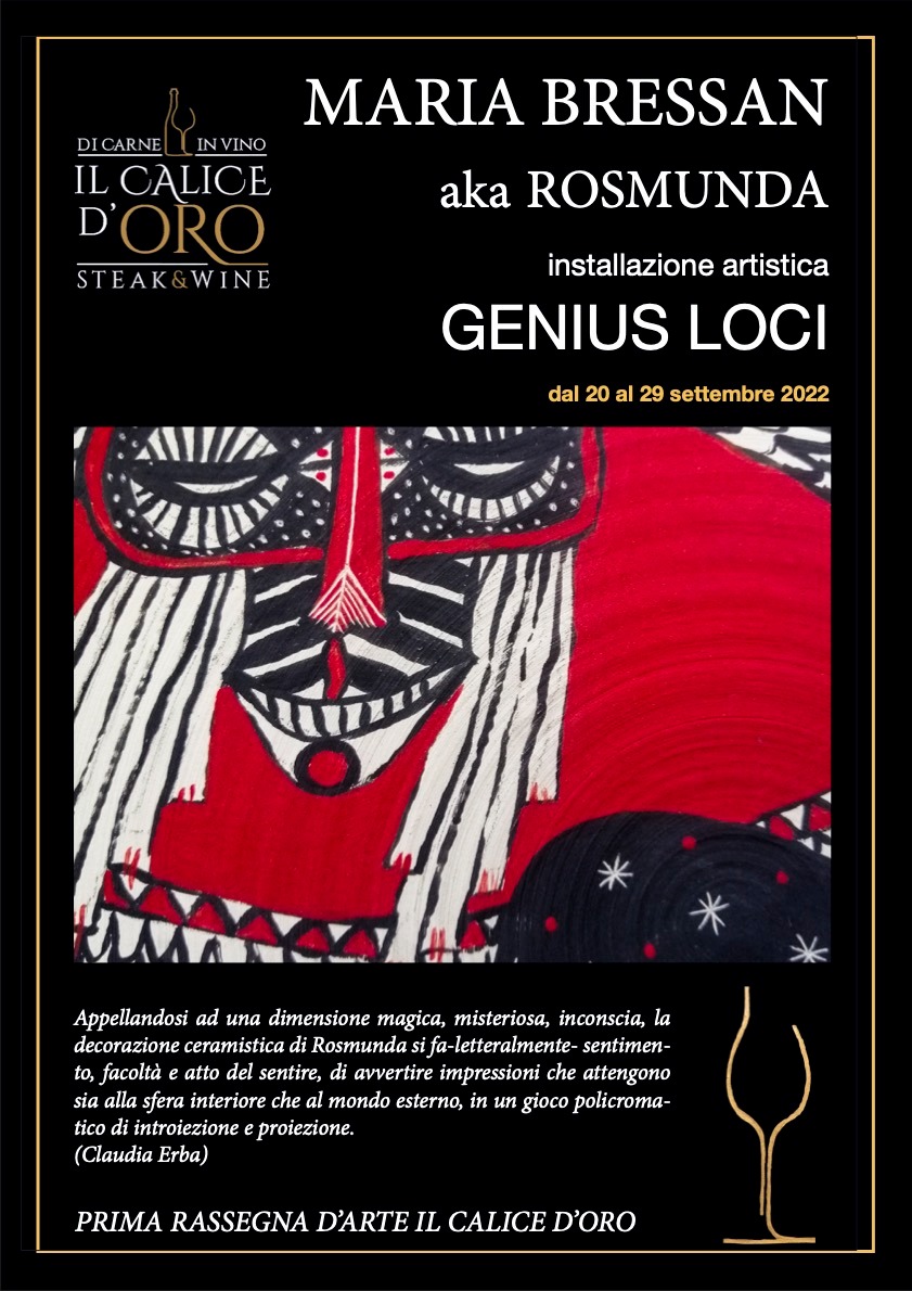 L’appuntamento con Genius Loci chiude infatti la Prima Rassegna D’Arte Il Calice D’Oro, iniziata ad aprile e curata dalla giornalista Claudia Erba: ben 14 eventi tra fotografia (Irene Franchi, Marco Sanna, Monica Selenu), poesia (Maria Teresa Tedde, Patrizia Cirulli), pittura (Lidia Tangianu, Monica Corda), canzone d’autore (Giovanni Luca Valea)- con un’ incursione nel mondo della discografia (Mimmo Paganelli)- Jewelry Design (La Ro' Gioielli), arte morbida (Cenzo Cocca, El Made), letteratura (Oliviero Malaspina e Giuseppe Cristaldi) e decorazione ceramica (Rosmunda), nella direzione dell’incontro semantico di differenti forme d’arte, talvolta contaminate (il riferimento è in particolare all'arte della cancellatura di Ljuba Spreafico, La Fabbrica delle Parole, che ha incontrato la poesia di Maria Teresa Tedde e al bellissimo lavoro di accompagnamento a Drammaturgia degli invissuti, confezionato dal produttore Salvatore Papotto, che ha cucito sul testo un veste sonora i grado di amplificarne l'intrinseca drammaticità).