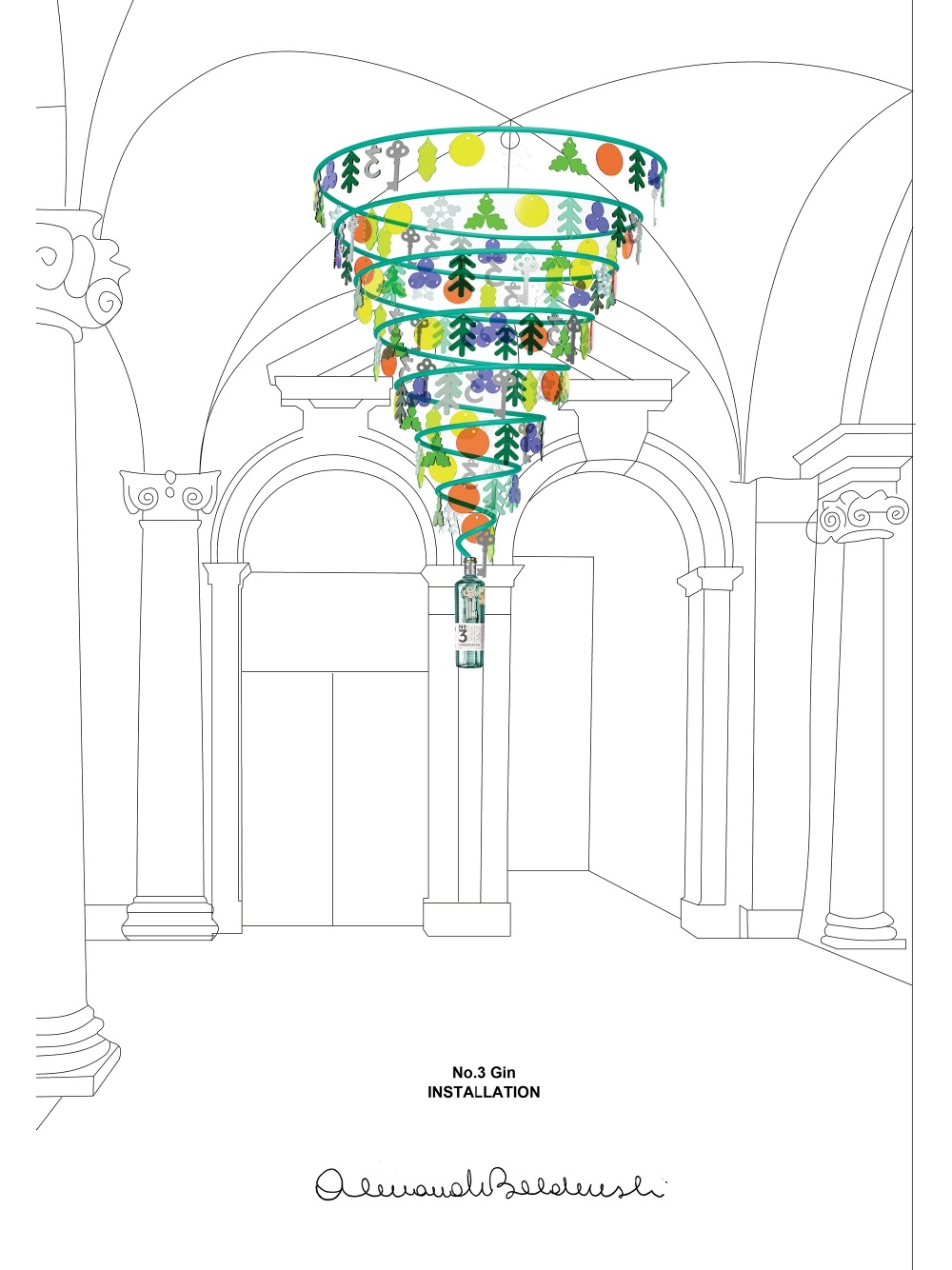 Questo suggestivo allestimento si propone di trasportare gli osservatori in un mondo di sapori intensi, scatenando un balletto di profumi che incanta i sensi. Il concetto che sottende all'installazione si ispira al mito del genio della lampada, dando vita a una spirale avvolgente che evoca un'atmosfera fiabesca. No. 3 London Dry Gin, rinomato per la sua eccellenza e pluripremiato, viene così reinterpretato in una fusione armoniosa di mixologia e arte.
