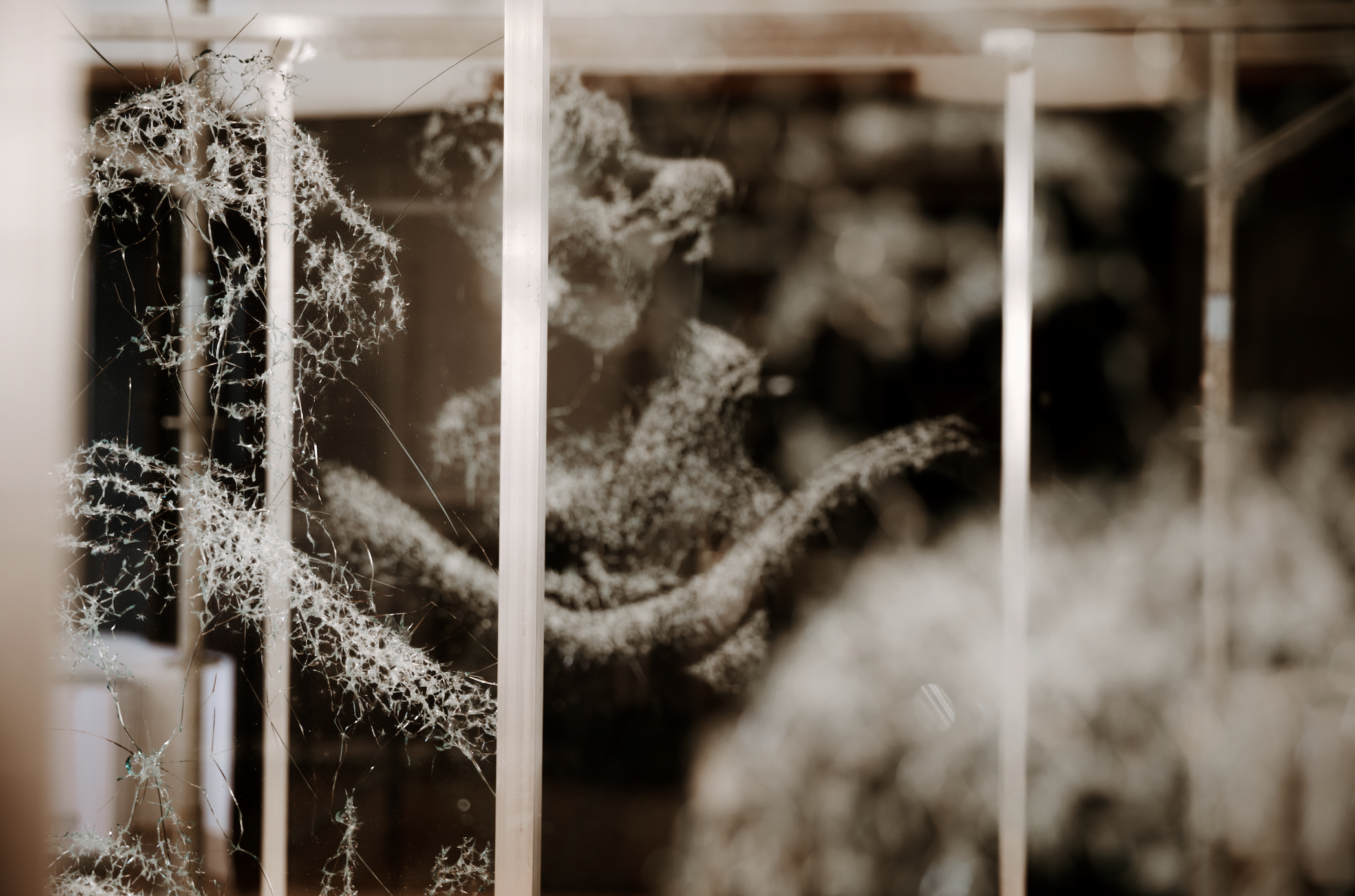 L’artista svizzero prende come punto di partenza lo straordinario esempio di virtuosismo scultoreo delle “Tre Grazie” di Canova, nella composizione e nel movimento. Le tre Grazie -Euphrosyne (l’allegria), Thalia (la bellezza giovanile) e Aglaea (l’eleganza)- vengono scomposte e, attraverso la tecnica della ‘morfogenesi’ di Simon Berger, vengono riproposte su tele di vetro crepate ed incrinate come figure disgiunte, dando vita ritratti scultorei bidimensionali, che rivelano i loro caratteri distintivi, il loro personale incanto e mistero.