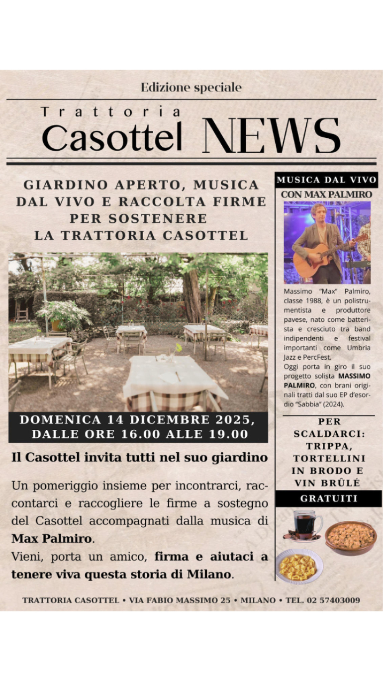 Domenica 14 dicembre – dalle 16:00 alle 19:00 - Giardino aperto • Raccolta firme • Musica dal vivo • Trippa, tortellini in brodo e vin brûlé gratuiti. Un invito a portare un amico, firmare e contribuire a tenere viva una storia che è molto più di un’insegna: è un frammento della Milano che resiste, accoglie e racconta.