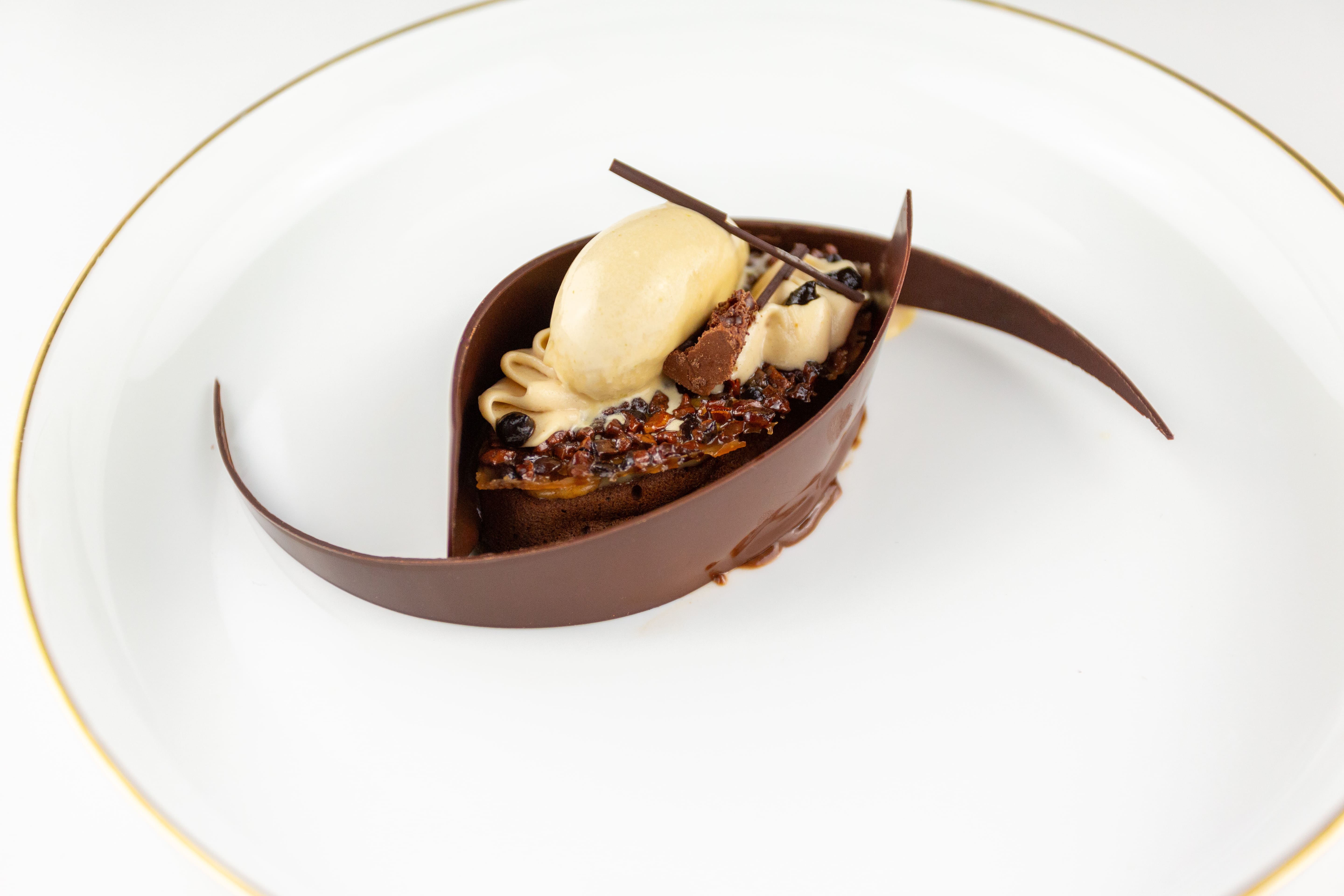 L’ultimo è il dessert al cioccolato, “Il Moro di Vico”, ispirato alla quotidianità di Nicoletta, la Torre del Saracino; il dolce racchiude la sua esperienza più recente, scandita da apprendimento di tecniche e familiarità con le materie prime. Si tratta di un tortino caldo dal cuore fondente con pralinato alle nocciole, croccante cialda al gruè di cacao, gelato al caramello, salsa profumata al lime e perle di aglio nero.