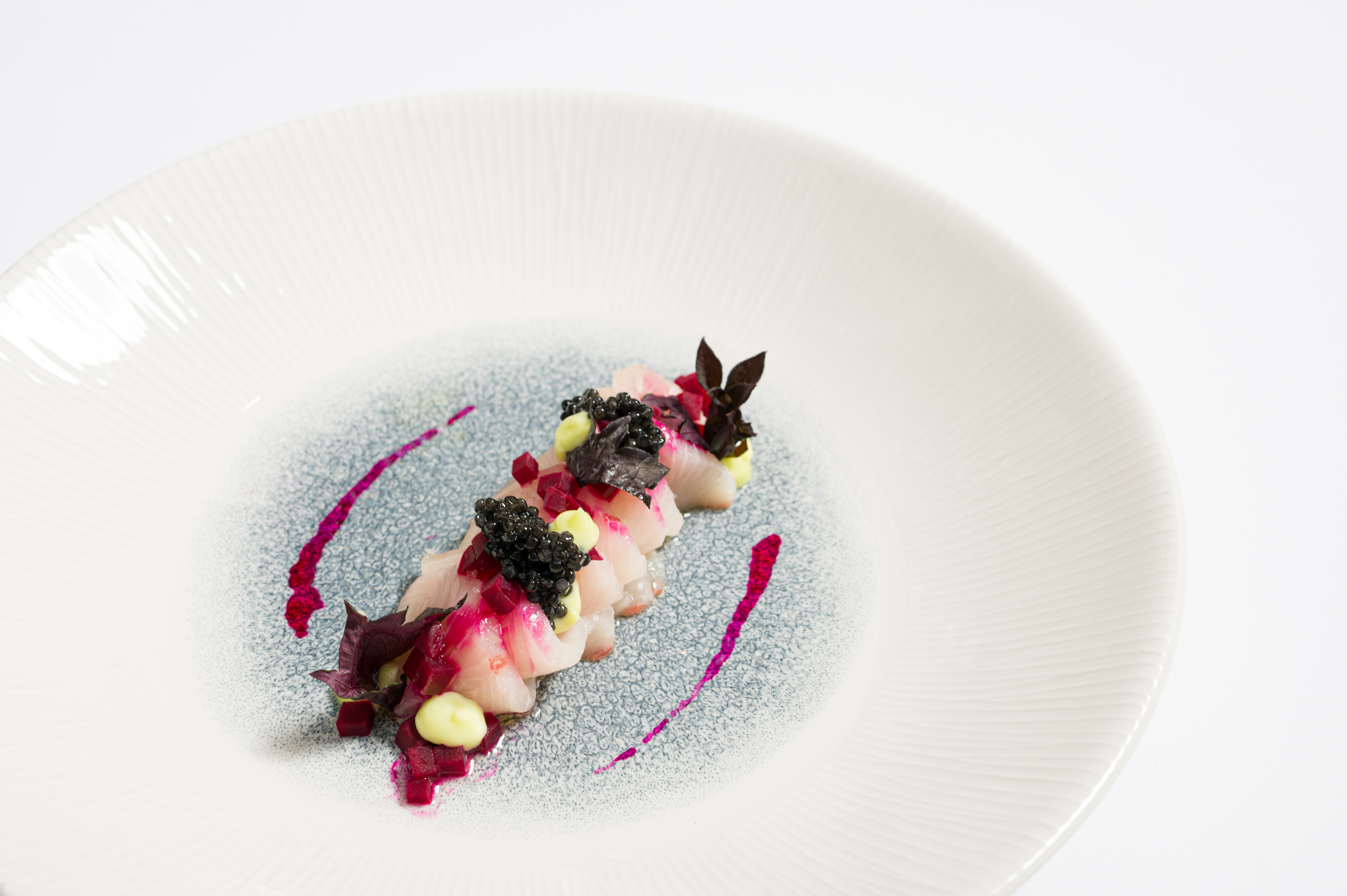Il percorso di degustazione si apre con un Sashimi di ricciola. La delicatezza del pesce si sposa armoniosamente con il cremoso alla mentuccia, mentre le rape in agrodolce aggiungono una nota decisa e colorata. Il caviale e il shiso, profumatissimi, completano il piatto.