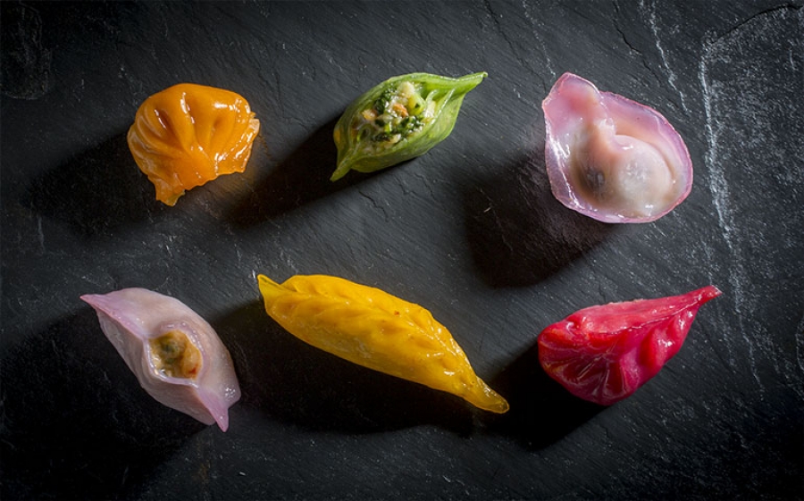 La specialità di Blue Ginger e dello chef Cheng Kang sono senza ombra di dubbio i tipici ravioli cinesi, i dim sum, proposti in tante curiose ed inedite varianti. Ci sono i dim dum in sfoglia di cioccolato con ripieno di astice, in sfoglia al mirtillo con ripieno di branzino, quelli in sfoglia alle bacche di Goji con ripieno di gamberi, quelli in sfoglia al basilico con ripieno di polpo e quelli in sfoglia al nero di seppia con ripieno di calamaro, oppure i ravioli in sfoglia alla barbabietola con ripieno di rombo, noci e mango, in sfoglia al lampone con ripieno di gamberoni e in sfoglia all’arancia con ripieno di salmone: un vero e proprio arcobaleno di dim sum.