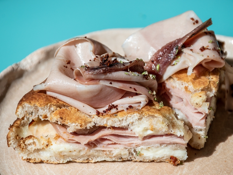 e ancora la Culaccia e zucchine, con culaccia, zucchine, puntarelle e robiola ai tre latti, la Fassona, con fassona piemontese battuta al coltello, insalata, pancetta croccante e cipolle stufate, la Rustica, con speck Riserva Alto Adige, ridicì, asparagi e gambero rosso crudo, e la Chiamatemi mortadella, con mortadella favola, squacquerone e acciughe del cantabrico.