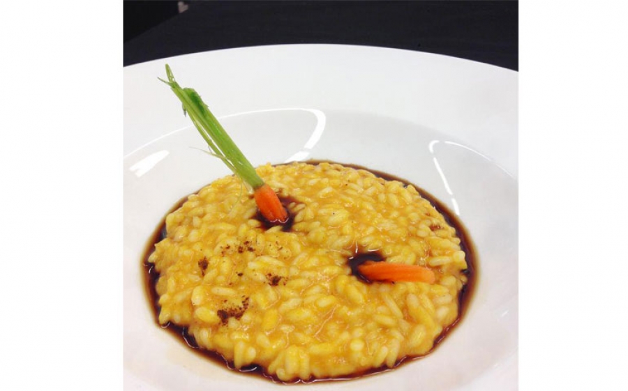 Per quattro persone la ricetta firmata Leandro Luppi prevede: 320 gr riso vialone nano, 50 gr olio e.v.o., del Garda 100 gr vino vegan – Brut Green Vegan di Quadra, 500 gr di carote, 100 gr di caffè espresso, 30 gr glucosio, 30 gr cardamomo, 5 gr macis macinato.