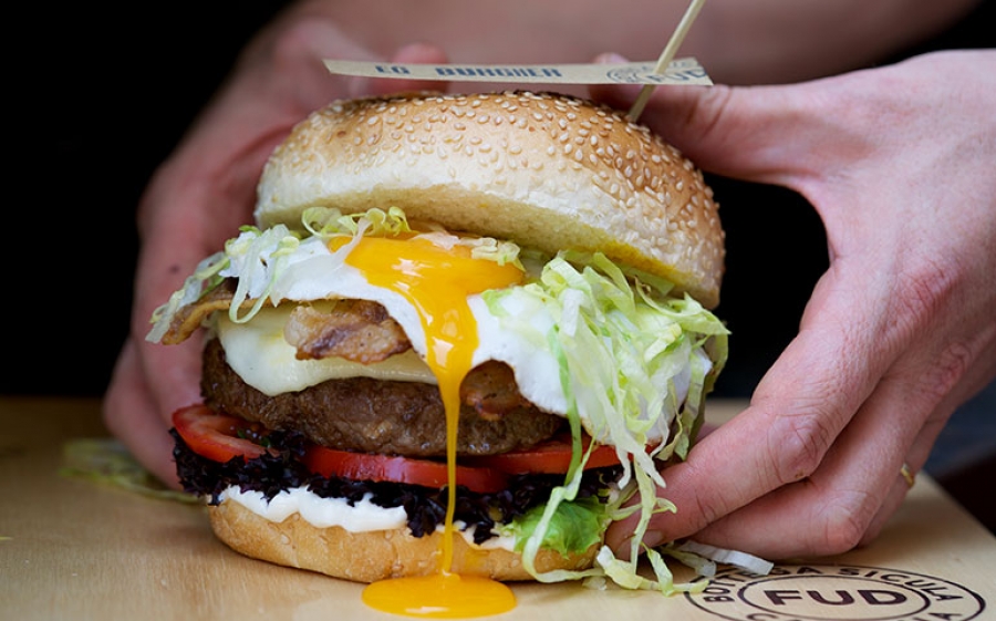Ma veniamo al dunque. Cosa si mangia da FUD? Una cucina gourmet ruspante senza fronzoli, fatta di hamburgher (di carne di manzo siciliano, di asino di Chiaramonte Gulfi (in provincia di Ragusa), di bufalo ragusano, di cavallo, di suino nero e di pollo modicano) al piatto o racchiusi in un inedito pane casareccio con semi, oddog (con wurstel di suino nero ibleo o di pollo modicano), patate e fritti, salumi e formaggi su tagliere (tra cui mortadella e salame d’asino, formaggi e affettati di bufalo ragusano, caprino girgentano, caciocavallo modicano, provola delle Madonie con cuore di manna, arancia e limone), e insalate. Per nulla scontate.