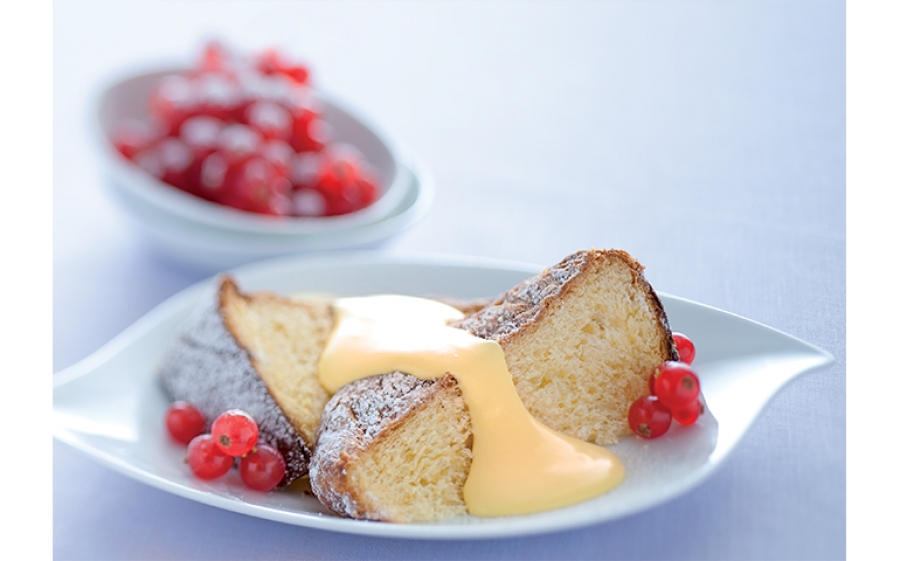 In una casseruola montate con una frusta i tuorli d’uovo con lo zucchero finché diventano chiari, incorporate la farina setacciata, mescolate ancora e aggiungete il latte e lo zafferano. Ponete la casseruola su fiamma media e cuocete per 10 minuti mescolando continuamente con un cucchiaio di legno finché la crema si sarà addensata. Lasciate raffreddare e mettete in frigorifero. Prendete il pandoro e servite con la crema calda o fredda a piacere, decorando con grappolini di ribes.
