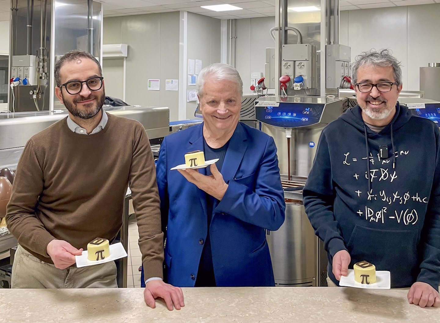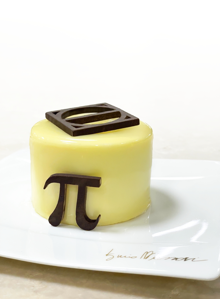 A rendere esplicito il gioco tra numeri e dessert è la decorazione finale in cioccolato che richiama il simbolo del Pi Greco e trasforma il dolce in un piccolo tributo visivo alla scienza.