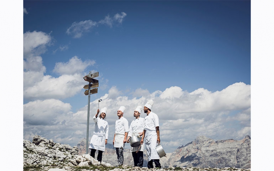 A Norbert Niederkofler (Saint Hubertus – Relaix & Chateaux Hotel Rosa Alpina, 2 stelle Michelin) è stato assegnato il colore bianco e per il rifugio Lée ha creato il dolce Mangianeve, a base di mousse di yogurt del maso, coulis di lamponi e croccantino. Il giallo è il colore di Matteo Metullio (La Siriola – Hotel Ciasa Salares, 1 stella Michelin), che al rifugio Pralongiá presenterà gli Gnocchi di patate allo zafferano su crema di peperoni gialli bruciati, profumo di limone, insalata di rape gialle e chips di polenta, mentre Nicola Laera (La Stüa de Michil – Hotel La Perla, 1 stella Michelin), cui è stato assegnato il colore blu, proporrà le Capesante scottate su testina di vitello, cipolla rossa all’agro, carote viola e jus al cassis, che potranno essere degustate al rifugio Col Alt. A Nicola Portinari (La Peca, 2 stelle Michelin) è stato assegnato il colore verde scuro e per il rifugio Jimmi ha creato il Raviolo aperto con ragout di cervo al melone e salsa al cassis, mentre il verde chiaro predomina la Crema di riso e sedano fredda, coregone affumicato, crostoni e olio crudo di Giancarlo Perbellini (Casa Perbellini, 2 stelle Michelin), che verrà servita al rifugio I Tablá. Giancarlo Morelli (Pomiroeu, 1 stella Michelin) si è cimentato in un piatto viola, presentando al rifugio Crëp de Munt la Lombatina di cervo candita al rabarbaro e senape con cubi di polenta bianca. L’arancione è il colore di Sebastiano Lombardi (Il Pellicano, 1 stella Michelin), ospite al rifugio Mesoles, per cui ha realizzato il Baccalà croccante, su crema di patata e carote e cipollotto, cime di rapa, caramello di lampone. Infine, Cristina Bowerman (Glass Hostaria, 1 stella Michelin), ispirandosi al colore rosso, ha creato per il rifugio Bioch le Tagliatelle con succo di rapa rossa con un pesto di erbe locali e pinoli grattati come formaggio.