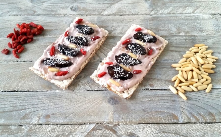 Tagliare le prugne a fettine sottili, spalmare la crema sulle fette, aggiungere le prugne e decorare con i pinoli e le bacche di goji. Spolverare con la farina di cocco e servire subito per fare in modo che le fette non perdano la loro croccantezza.