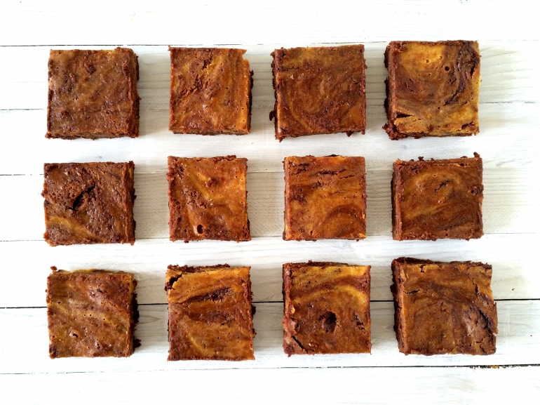 imburra ed infarina una teglia rettangolare di circa 20×30 cm. versa metà impasto al cioccolato stendendolo bene su tutta la teglia. aggiungi metà impasto alla zucca e spalmalo su quello al cioccolato. quindi versa i rimanenti impasti al cioccolato e alla zucca alternati. passa un coltello sulla superficie dei 2 impasti per ottenere un effetto marmorizzato. inforna la teglia a 180 gradi per 40 minuti. non cuocere più a lungo altrimenti i brownies diventeranno secchi ed asciutti. lascia raffreddare il composto poi taglia i brownies a quadrati, ne dovrebbero venire 20.
