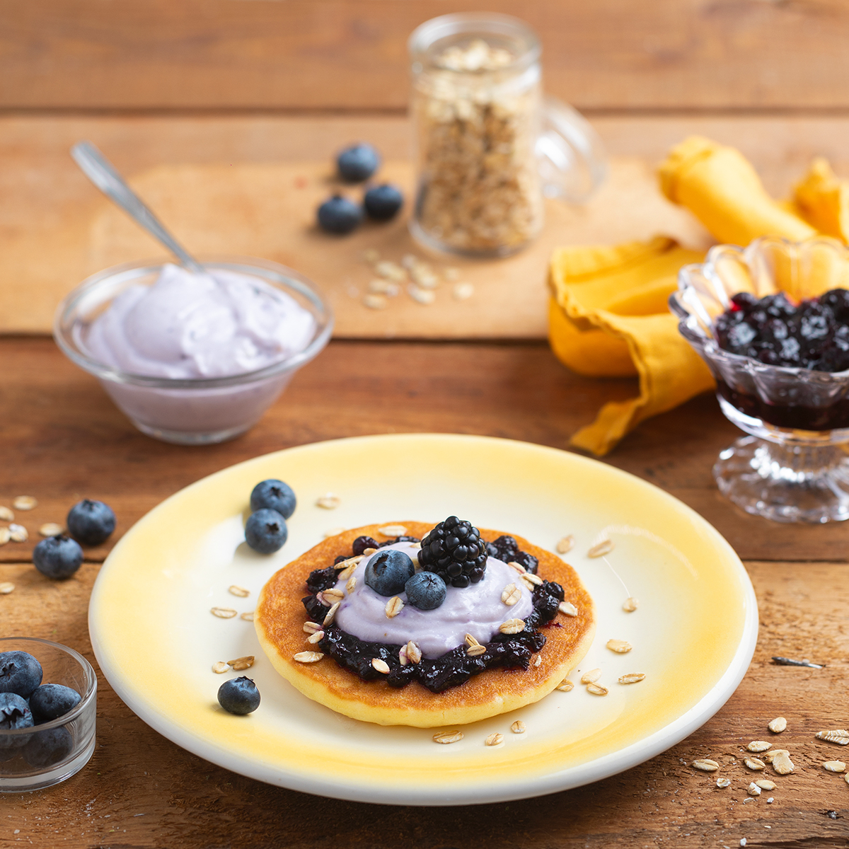 PANCAKE CON COMPOSTA DI MIRTILLI E MORE, AVENA IN FIOCCHI E SPUMA DI RICOTTA