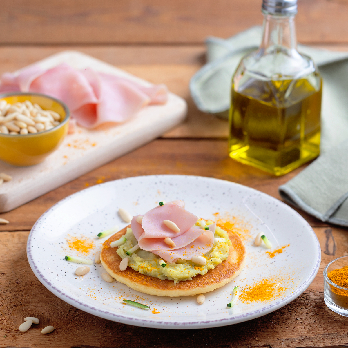 PANCAKE CON CREMA DI ZUCCHINE, PINOLI TOSTATI, PROSCIUTTO COTTO E CURCUMA