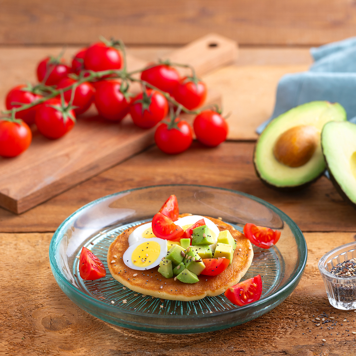 PANCAKE CON AVOCADO E UOVO SODO, POMODORINI E MIX DI SEMI