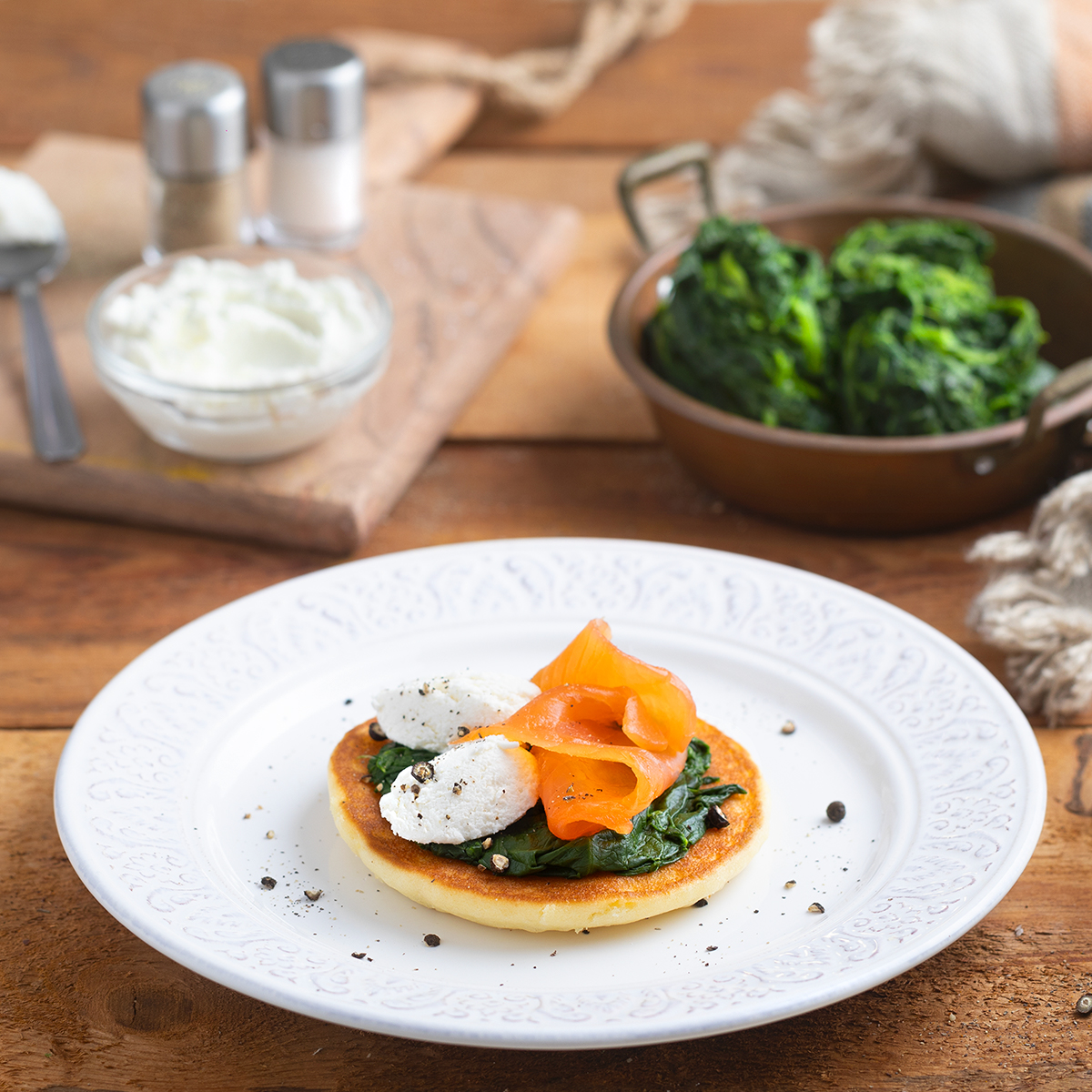 PANCAKE CON SPINACI SALTATI, FORMAGGIO SPALMABILE E SALMONE AFFUMICATO