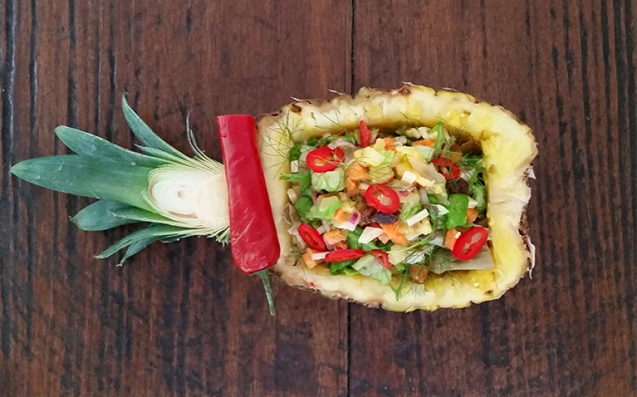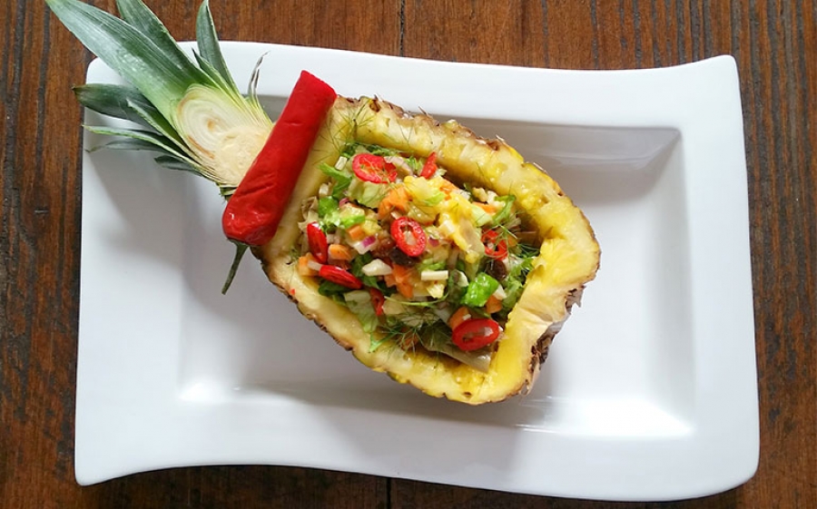 Condite l'insalata mescolandola bene. Versate l'insalata nell'ananas svuotato e tenetela in frigorifero fino al momento di servire.