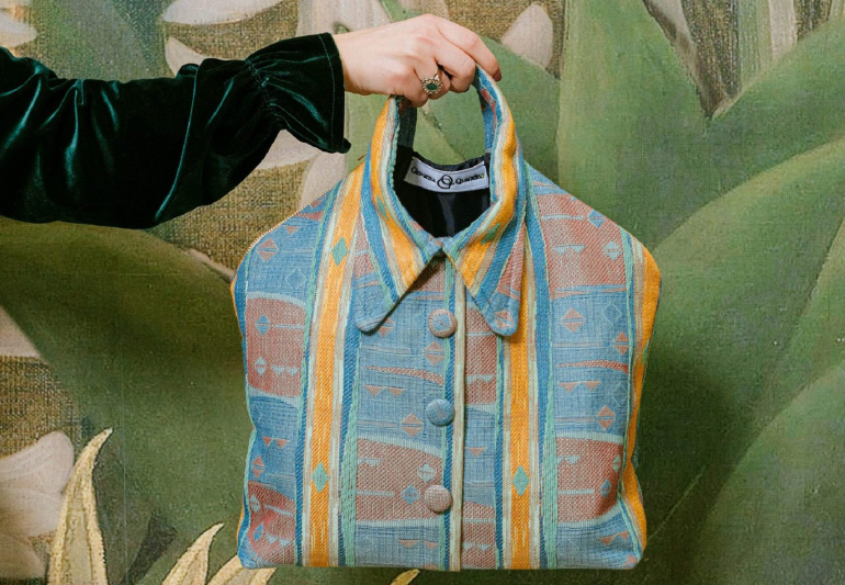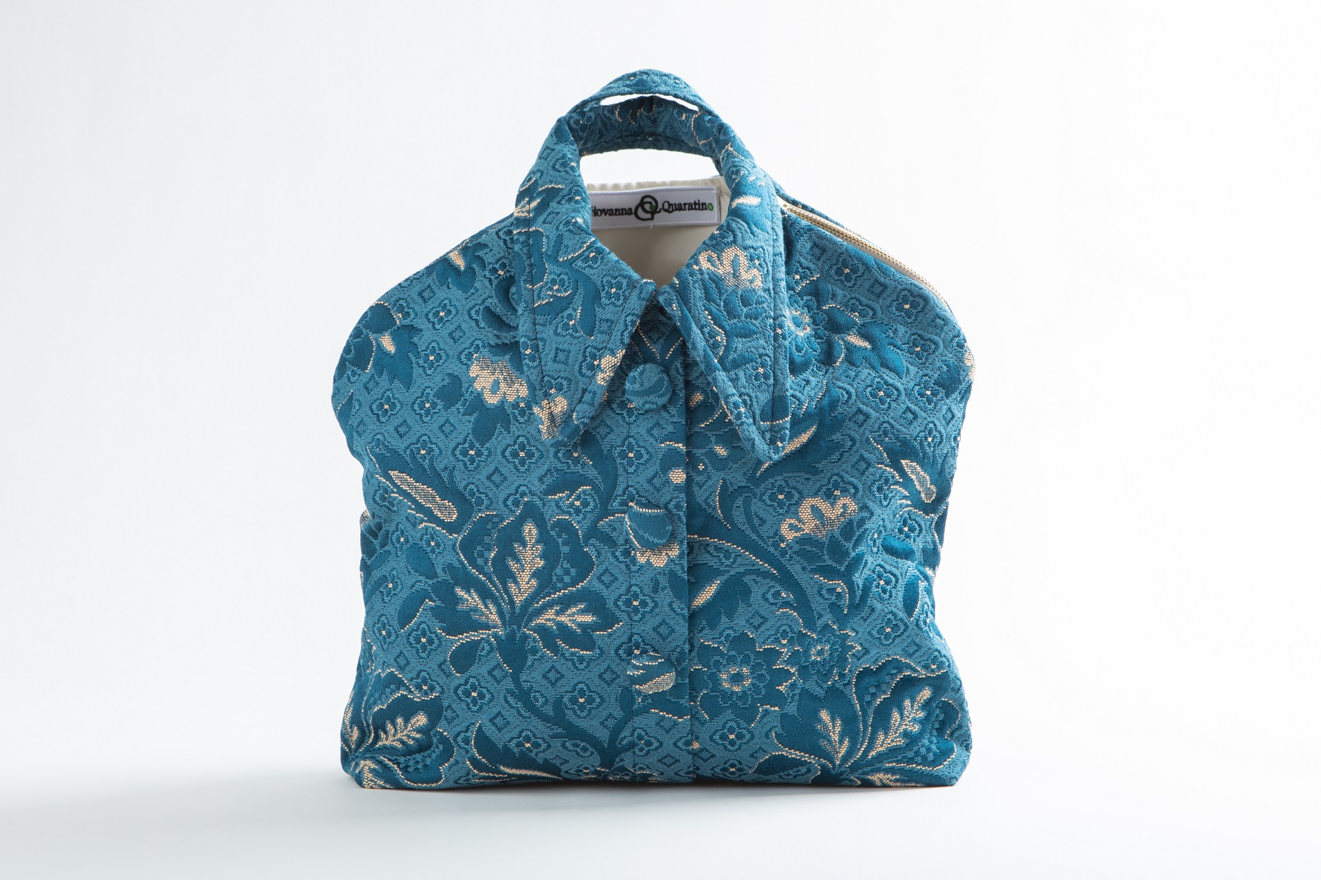 Una spiritosa camicia - borsetta che segue la filosofia slow fashion: ogni capo Giovanna Quaratino è preziosamente realizzato interamente a mano, con tessuti derivanti da scampoli vintage o pellami in metraggi limitati, valorizzando ciò che è stato già prodotto ma non utilizzabile per grandi produzioni. Un brand eco friendly dove si evitano sprechi e sovrabbondanza, valorizzando le materie prime e scegliendo packaging plastic free.