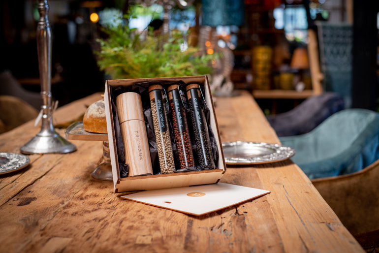 Progetto nato dall’idea di due viaggiatori della Repubblica Ceca, David e Klara, che scoprono il pepe di Kampot durante un viaggio in Cambogia e rimangono colpiti dalla dura realtà di sfruttamento umano ed ambientale. Pochi mesi dopo fondano .pepper..field per sostenere più di 200 famiglie di agricoltori cambogiani, garantendo loro un guadagno diretto e stabile e condizioni di lavoro dignitose, con un progetto di filiera sostenibile, solidale e di commercio equo. Per il Natale 2022 propongono il pepe di Kampot, il più pregiato al mondo, in lussuose confezioni regalo che celano al loro interno le diverse varietà di pepe nero, rosso, bianco, abbinate a macinini in legno o ceramica di altissima qualità.