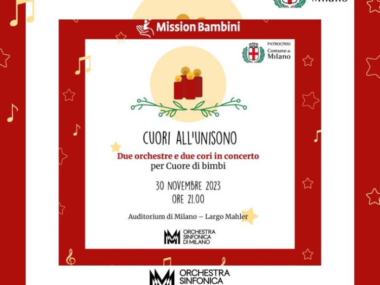 Giovedì 30 novembre, alle ore 21, all’Auditorium di Milano (Largo Gustav Mahler), si tiene Cuori all’unisono, una speciale serata di musica e canto per grandi e piccini dedicata ai bambini affetti da malattie cardiache seguiti da Mission Bambini con il progetto Cuore di bimbi.