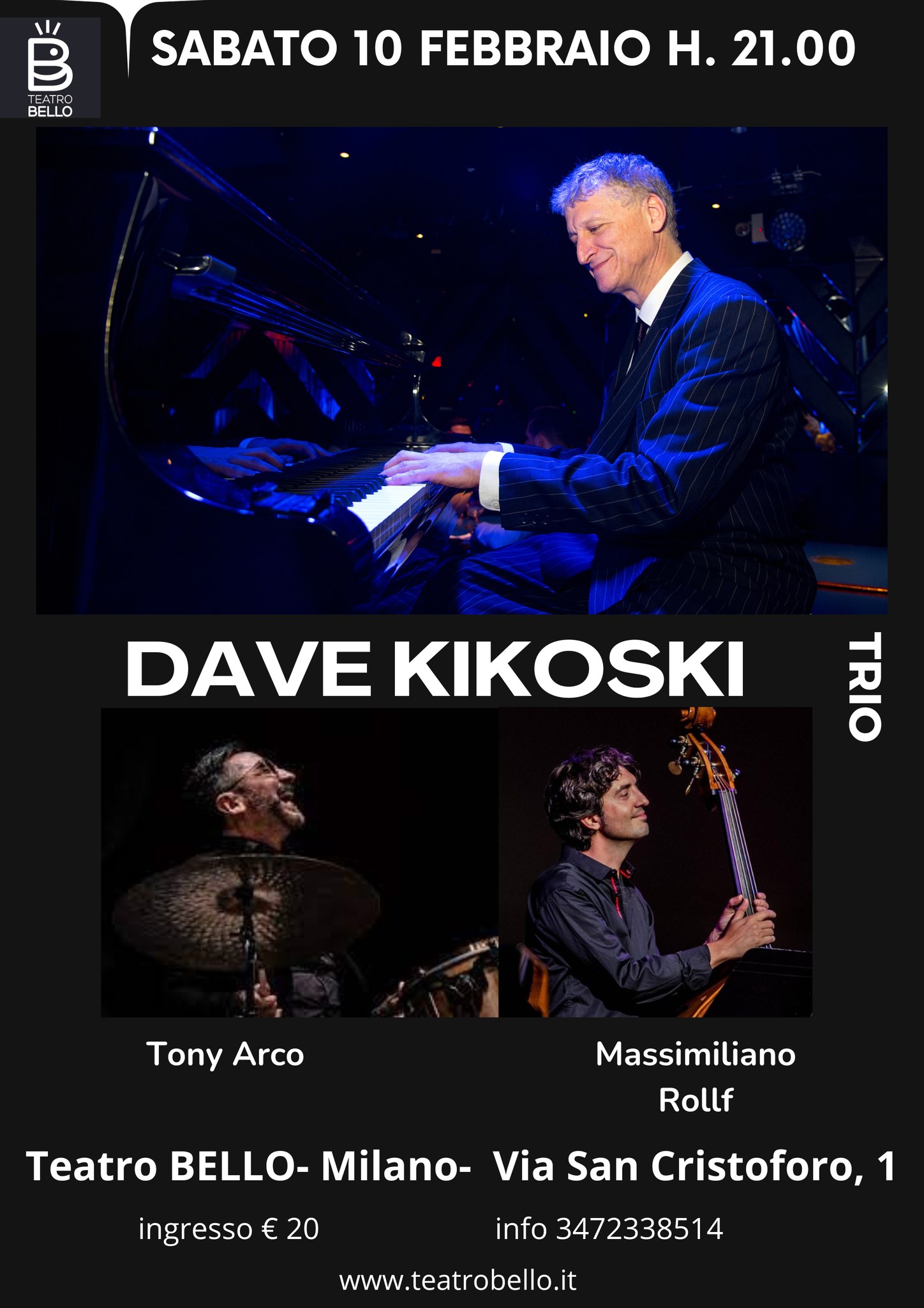 Appuntamento imperdibile per gli amanti del jazz: David Kikoski, uno tra i più acclamati pianisti jazz statunitensi, in trio con il batterista milanese Tony Arco ed il contrabbassista ligure Massimiliano Rolff, live in esclusiva al Teatro Bello (Via San Cristoforo 1, Milano) sabato 10 febbraio, ore 21.00.