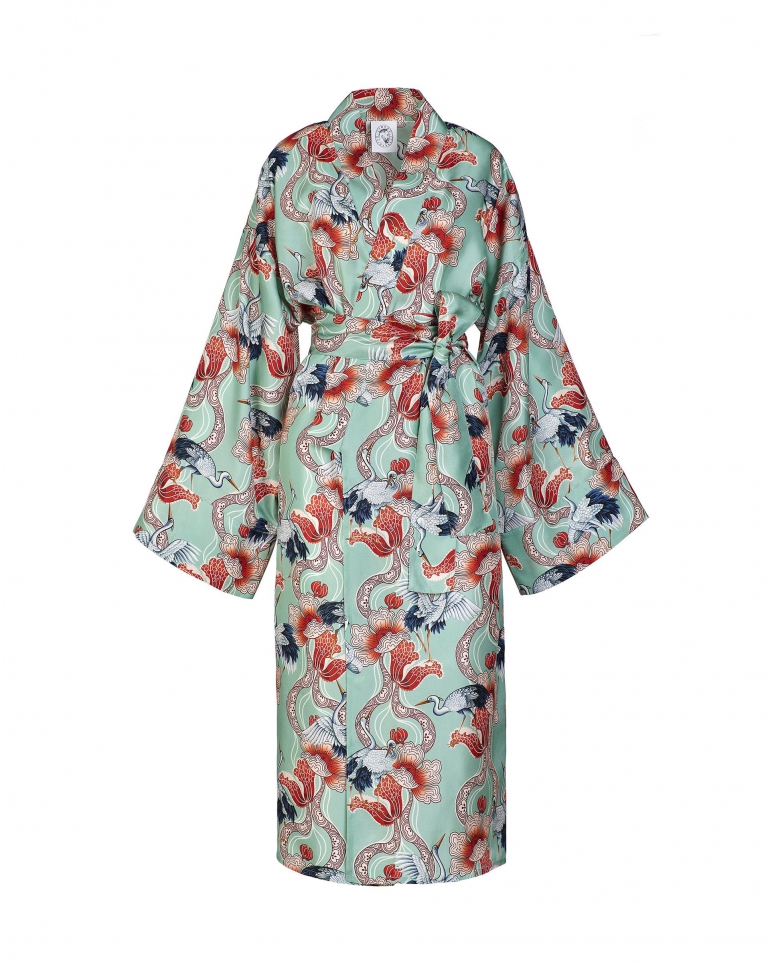 Capo genderless e senza taglia, con le maniche ampie e la cintura stampata, viene proposto con le lussuose stampe King of the RosesSecret GardenBig Friendly GiantWings of Water.