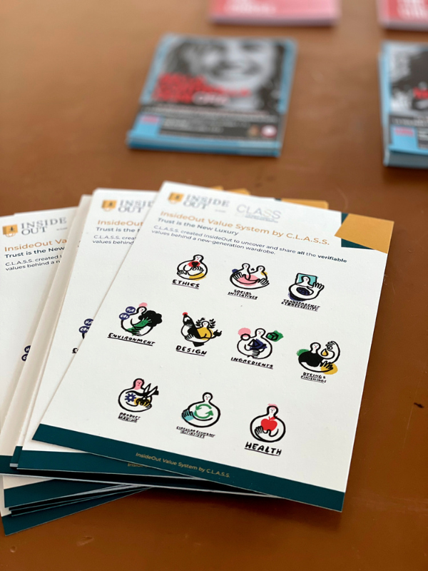 InsideOut, ideata da C.L.A.S.S. Eco Hub, nasce dal bisogno di far emergere e valorizzare ogni aspetto misurabile del guardaroba di nuova generazione. Così dando voce a ciò che spesso rimane invisibile tra un capo di abbigliamento e l’altro. Oltre dei valori esteriori come estetica, performance, look & touch; introduce 10 parametri che riguardano: Etica, Iniziative sociali, Tracciabilità e Trasparenza, Ambiente, Salute, Iniziativa Economica Circolare, Design, Ingredienti, Produzione, Tintura e Finissaggio.