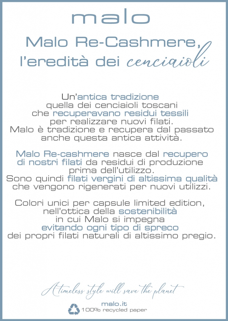 «Malo Re-Cashmere rappresenta un’antica tradizione, quella dei cenciaioli toscani che recuperavano residui tessili per realizzare nuovi filati. Malo, maison fiorentina specializzata in maglieria di cashmere, che da sempre valorizza la tradizione, riprende questa antica attività, sostenibile ante-litteram.