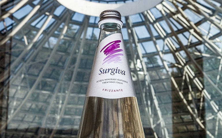 Il vetro, sinonimo di purezza e trasparenza, è l’elemento che congiunge Acqua Surigva che sgorga nell’incontaminato Parco Naturale Adamello Brenta, e il Mart di Rovereto disegnato dall’archistar Mario Botta. Come Acqua Surgiva viene imbottigliata in vetro per mantenere inalterate le sue qualità organolettiche, così l’iconica cupola del polo museale Mart è realizzata in vetro.