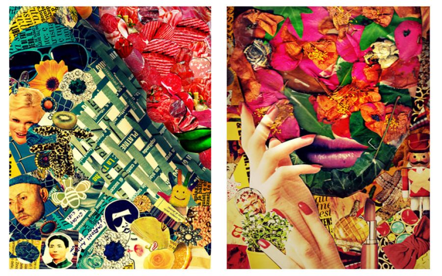 In mostra, stampe e collage, tecnica questa particolarmente cara a Carlotta: riviste, cataloghi e imballaggi diventano il nuovo pennello, i colori violenti dei volantini pubblicitari trovano nelle sue mani nuovi significati e forme, guidate dal desiderio di trasformare la banalità quotidiana in qualcosa di bello, diverso, sorprendentemente kitsch.