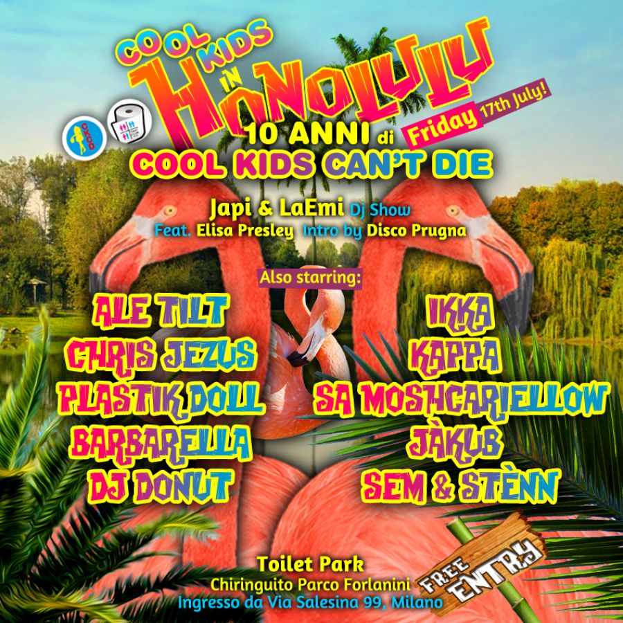 Venerdì 17 luglio a partire dalle ore 22:30 COOL KIDS CAN’T DIE festeggia il suo compleanno nella location estiva del Toilet Park, nel Parco Forlanini di Milano. Sono infatti passati dieci anni dall’esordio del Queer Party più famoso di Milano, ma COOL KIDS CAN’T DIE, party dopo party, è sempre in crescita e in movimento e continua ad essere un appuntamento fisso per il suo affezionato pubblico. Lo spettacolo sarà garantito, tra travestimenti e coinvolgimenti del pubblico della notte, dall’eclettico dj show di Japi & LaEmi, con la partecipazione di Elisa Presley e Disco Prugna, che introdurrà la serata.